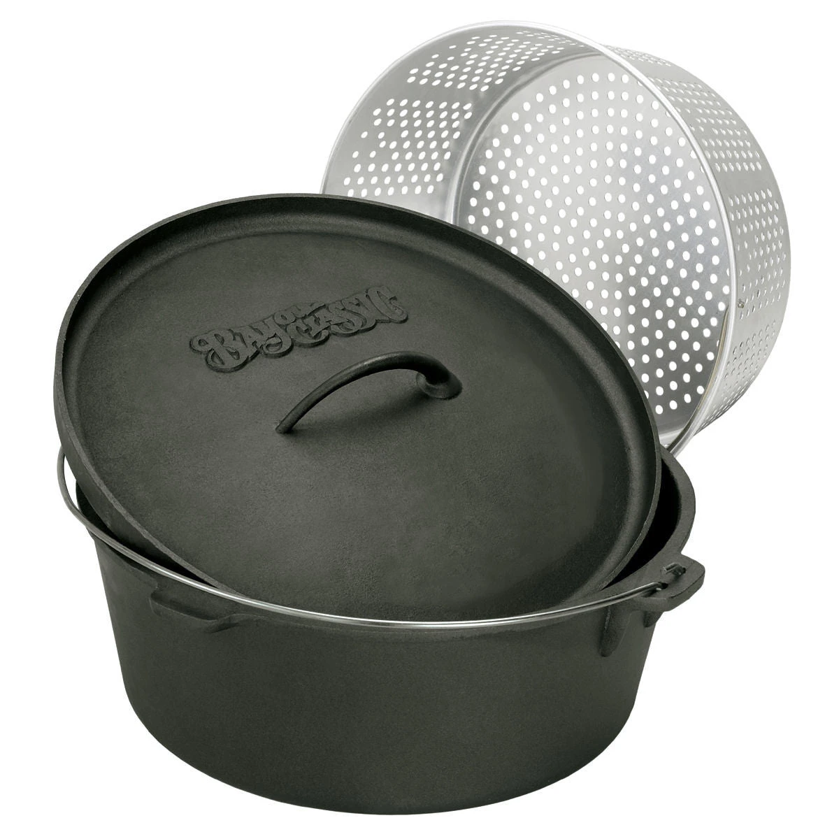 The Bayou Classic 8.5 Quart Cast Iron Dutch Oven is well known for this dutch oven’s quality. Cheaper dutch ovens have that rough, pitted feel making the competitor’s dutch oven hard to clean. The included cast iron dutch oven lid is unique due to its raised lip, which is designed for cooking bread or rolls on top. You may also use the lid as a iron griddle. The Bayou Classic 8.5 Quart Cast Iron Dutch Oven also includes a perforated aluminum basket with handle. If you have a tripod, you may use the wire handle for hanging. The 8.5 Quart Cast Iron Dutch Oven measures 11 1/2” D x 5” H. This is our BEST SELLING cast iron dutch oven.