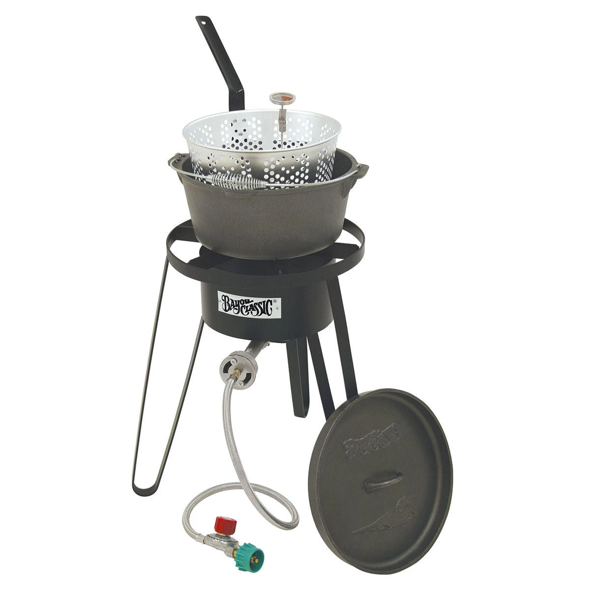 The Bayou Classic Cast Iron Deep Fryer Cooking Kit features all the deep frying cooking tools you need to fry and eat in style. Take this cast iron deep fryer cooking kit almost anywhere from the campground to the backyard. The outdoor propane burner that is included with the Bayou Classic Cast Iron Deep Fryer Cooking Kit has Bayou Classic’s unique leg design, which provides stable footing on the most rugged terrain. The fire may be turned down to simmer the smallest cup of coffee. The Bayou Classic Cast Iron Deep Fryer Cooking Kit includes Bayou Classic’s 8.5 quart cast iron dutch oven, dutch oven cast iron lid, deep fryer basket, tall high pressure outdoor propane burner, high pressure regulator and hose kit.