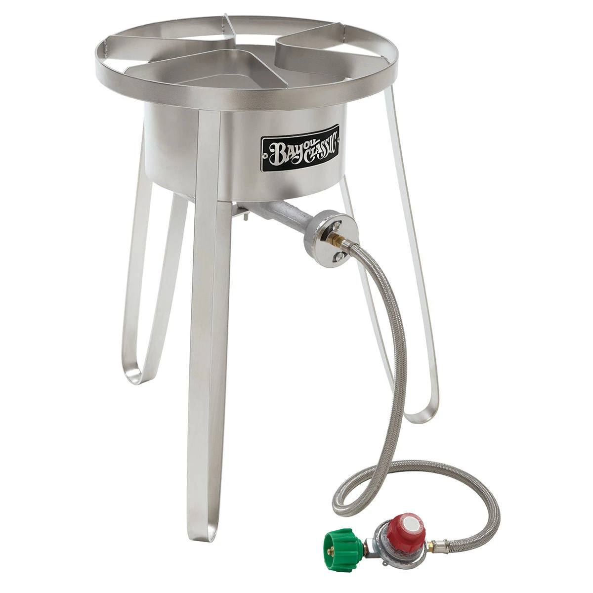 The Bayou Classic Stainless Propane Burner is the taller version of our popular SP10 propane burner. The Bayou Classic Stainless Propane Burner has a hot flame. However, due to the height, the Bayou Classic Stainless Propane Burner is the better burner for your smaller pots like our 10 – 14 quart pots.