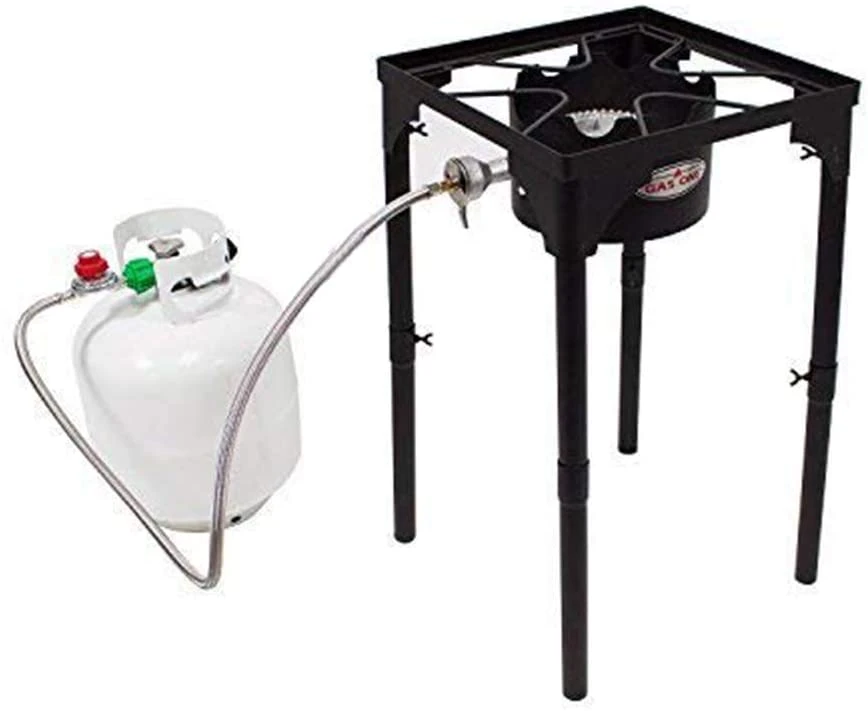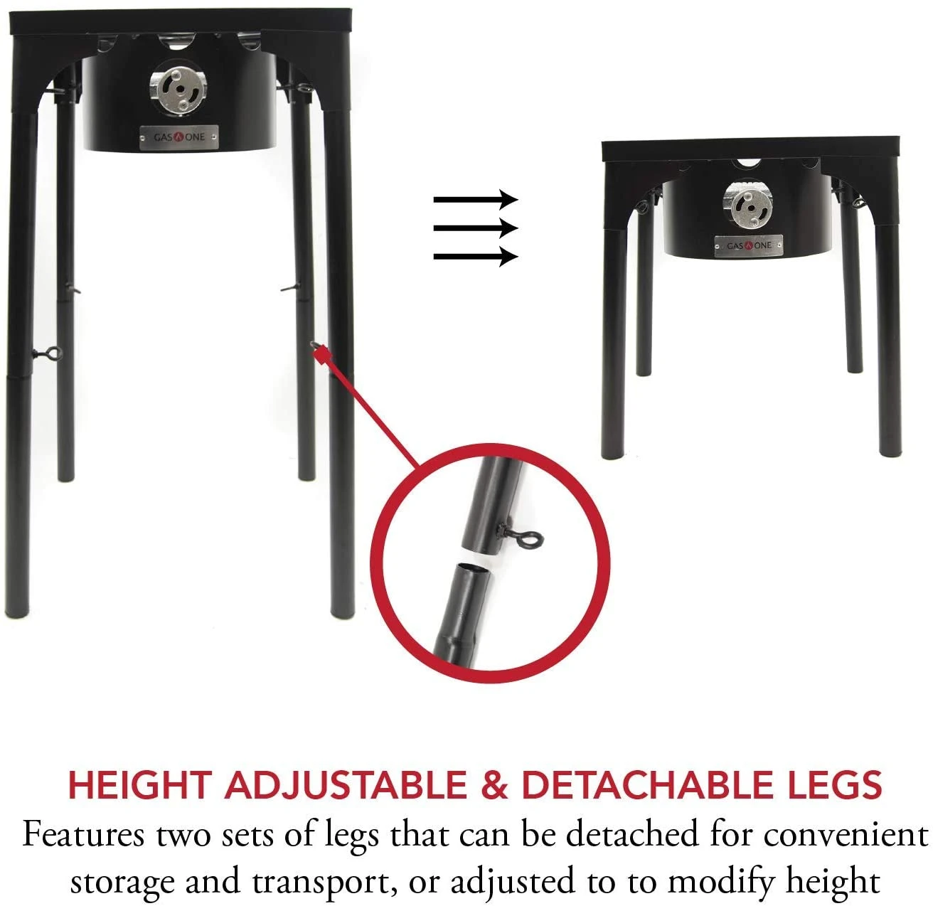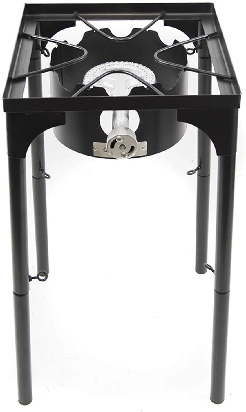 The Tall High Pressure Propane Burner comes with TWO sets of adjustable legs so you can change the height of this versatile Tall High Pressure Propane Burner. We suggest this Tall High Pressure Propane Burner if you pan on frying fish as well as using it to boil larger pots and turkey frying. This tall high pressure propane burner is perfect for your large 20 quart dutch ovens all the way down to your smallest cast iron cookware. The face of the cooking area measures 15.75 x 15.75 inches.