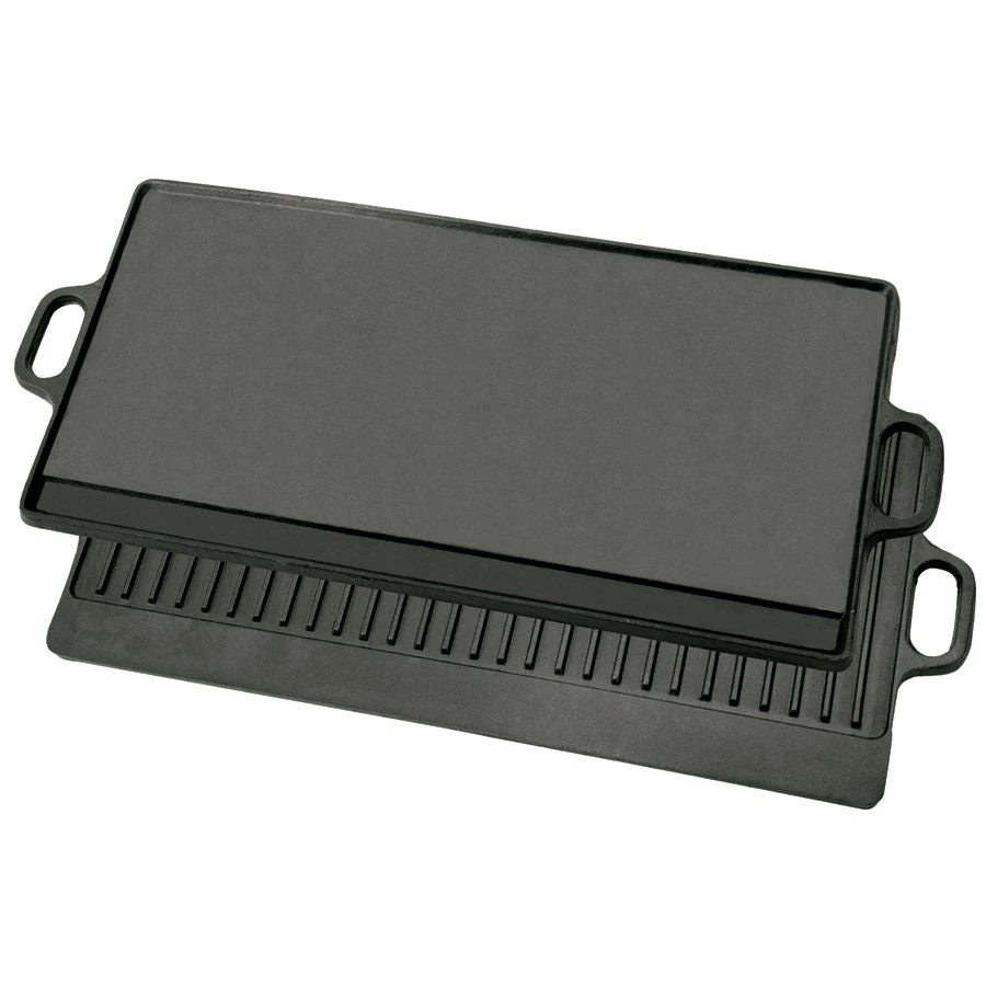 Bayou Classic Cast Iron Large Reversible Griddle offers two different grilling surfaces. What makes the Bayou Classic Cast Iron Large Reversible Griddle different from all of Bayou Classic’s other griddles is its size and indention for food drippings. One side of this cast iron griddle is ribbed for chicken and steaks. The other side of this cast iron griddle is flat, perfect for pancakes, French toast or toasted cheese sandwiches. The edges of this cast iron griddle are slightly raised for catching food drippings. The square version of Bayou Classic’s cast iron griddles fits perfectly on a double propane burner or over two stove burners. The Bayou Classic Cast Iron Large Reversible Griddle measures 14 inches by 28 inches.