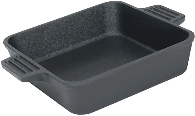 The Bayou Classic Cast Iron Baking Pan Set includes two cast iron bake pans – 8 x 8, The size are what is used most in an everyday kitchen. Cast iron baking pans have handles. Perfect for cornbread, biscuits and casseroles!