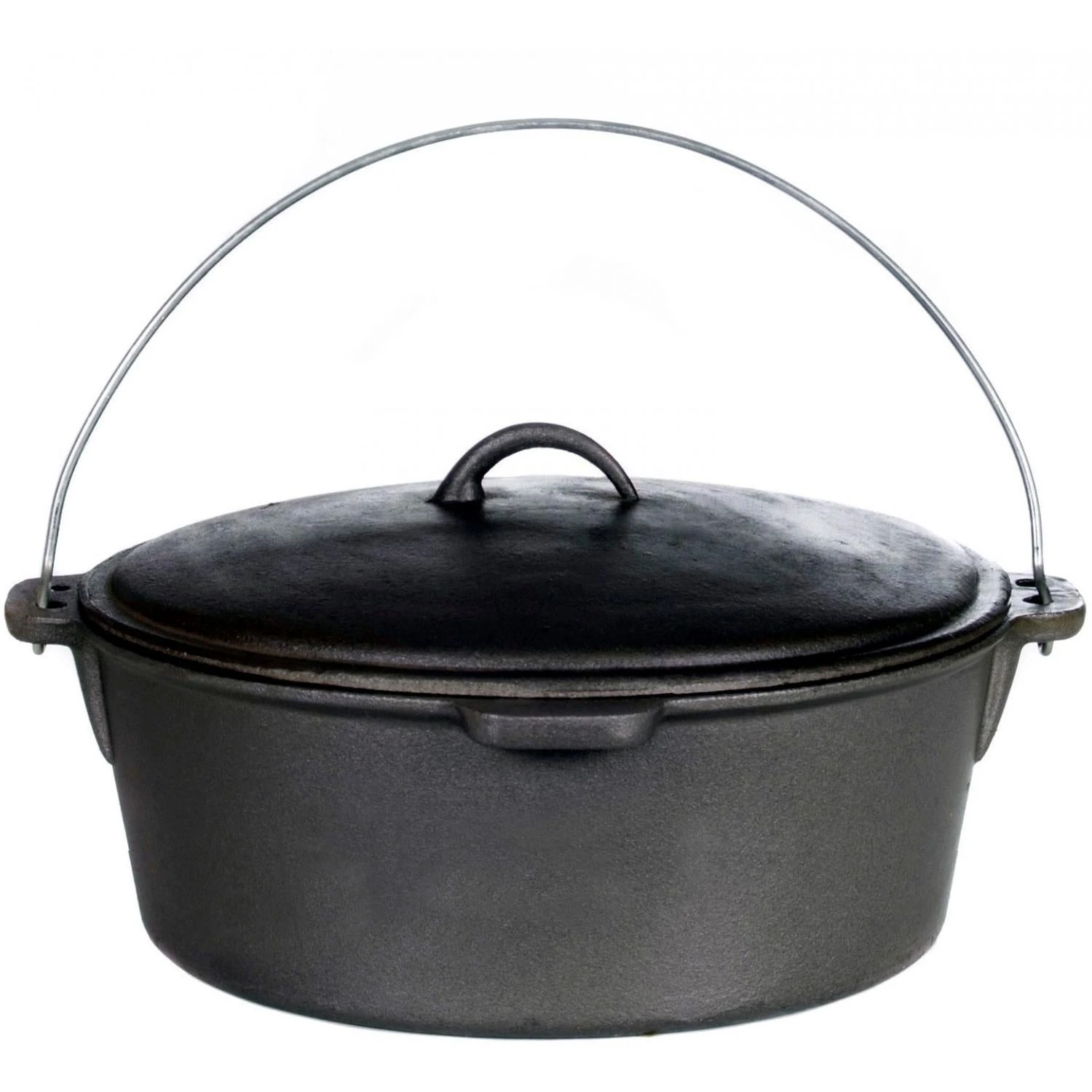The Cajun Classic dutch oven is made of heavy-duty seasoned cast iron and includes a lid. This Cajun Classic dutch oven interior measures 16. 25 inches wide x 6. 5 inches deep. This Cajun Classic dutch oven is pre-seasoned to perfection and ready for use. Cast iron cookware makes for superior heat retention and even heating of foods. Heavy-Duty and durable, designed to last for years. Hand wash with stiff brush and hot water.