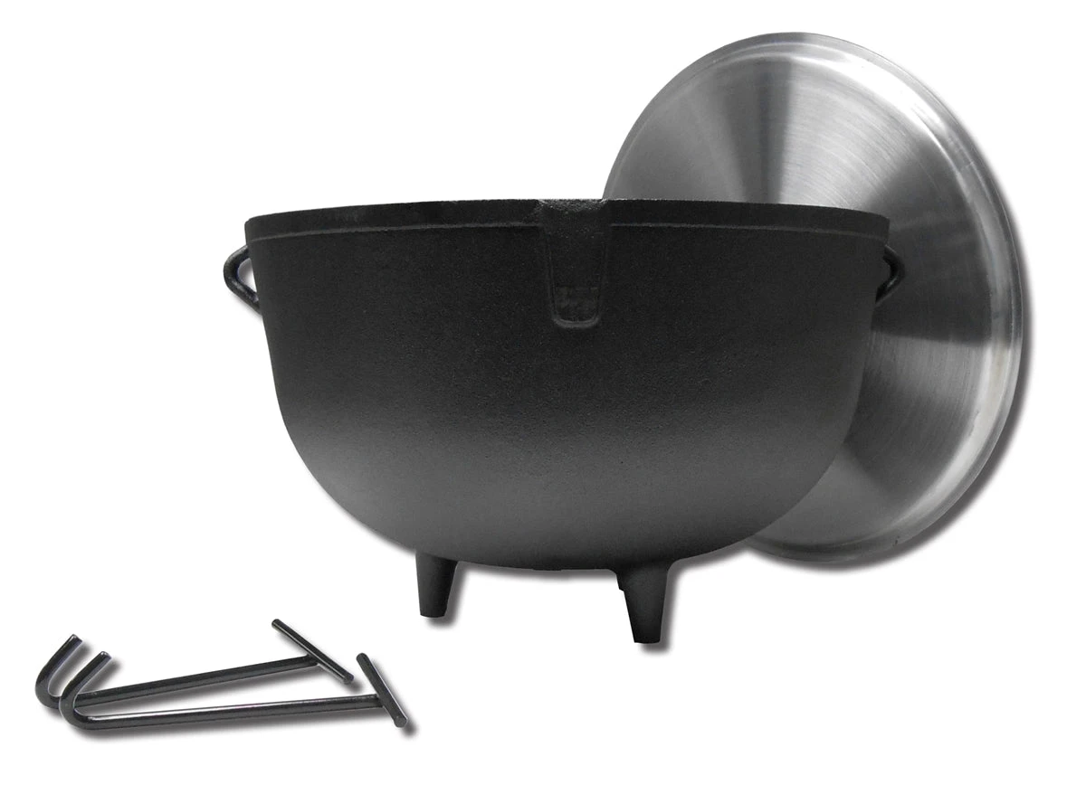 This 10 gallon cast iron pot is seasoned with a diameter of 20 inches and height of 13.25 inches and holds 40 quarts. This 10 Gallon Cast Iron Pot includes a jambalaya pot lid and pot hooks.