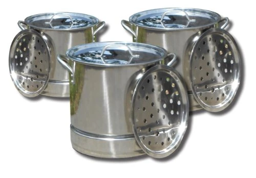 Professional Stainless Steel Stock Pot Set includes three large stainless steel stock pots with lids and steamer plates. The steamer plates make the Professional Stainless Steel Stock Pot Set steamer pots. This Professional Stainless Steel Stock Pot Set is made of stainless steel for easy cleaning and low maintenance. The Professional Stainless Steel Stock Pot Set includes 32, 44 and 52 quart stainless steel stock pots with lids.